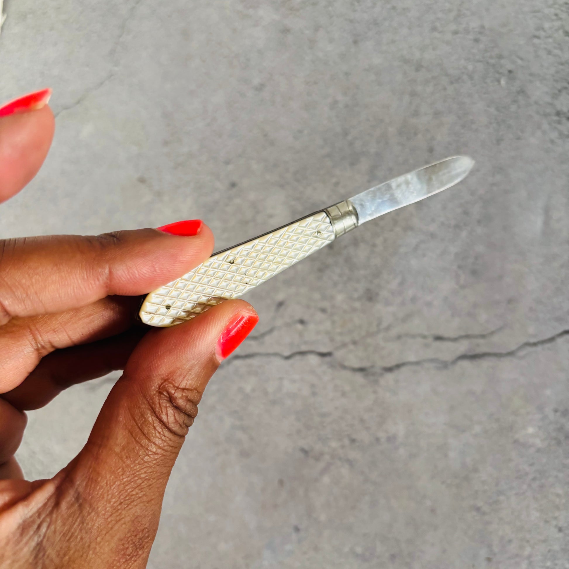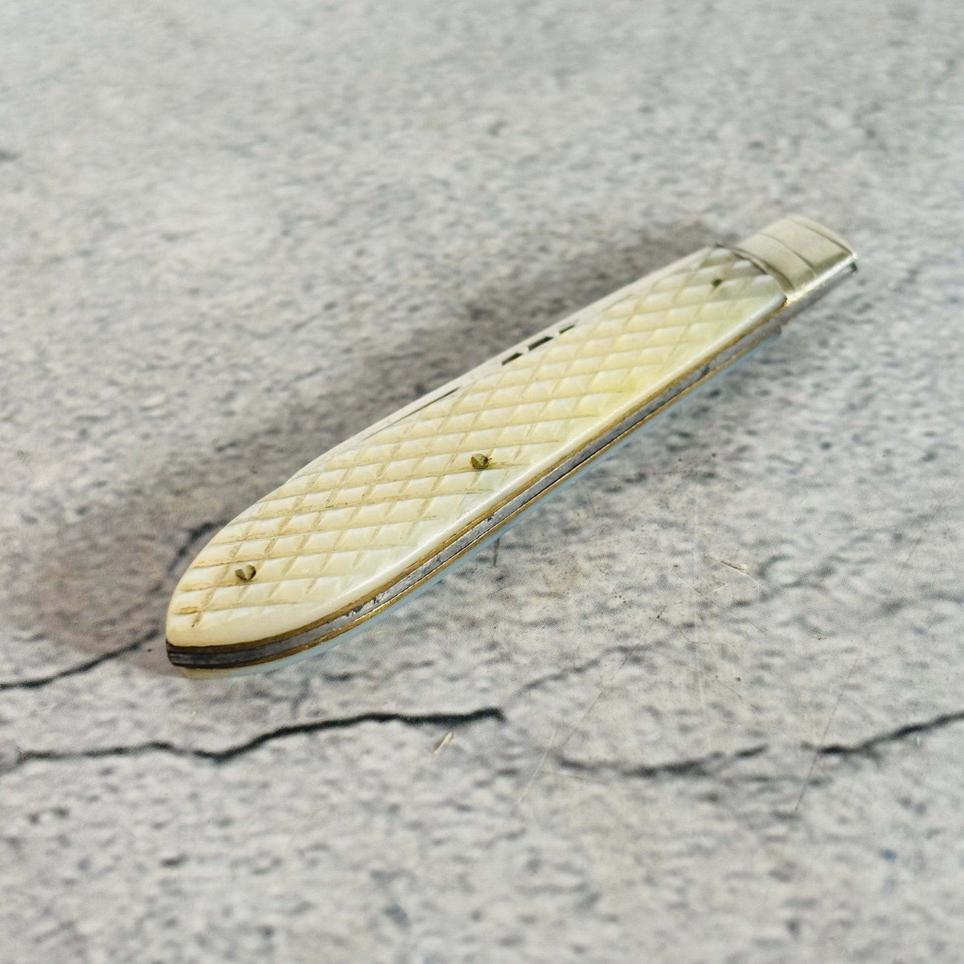 Genuine mother of pearl handle is of honeycomb textured finish