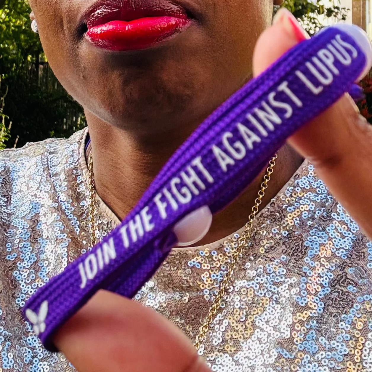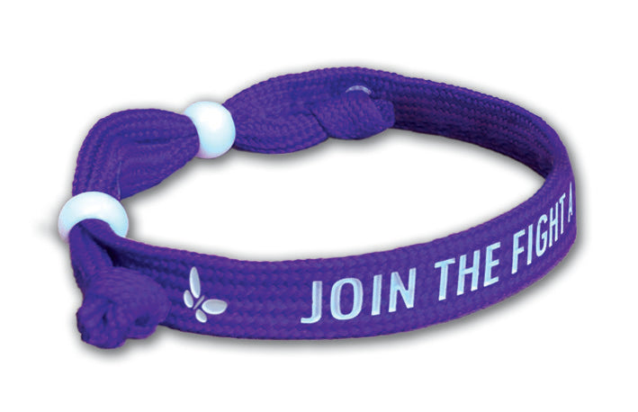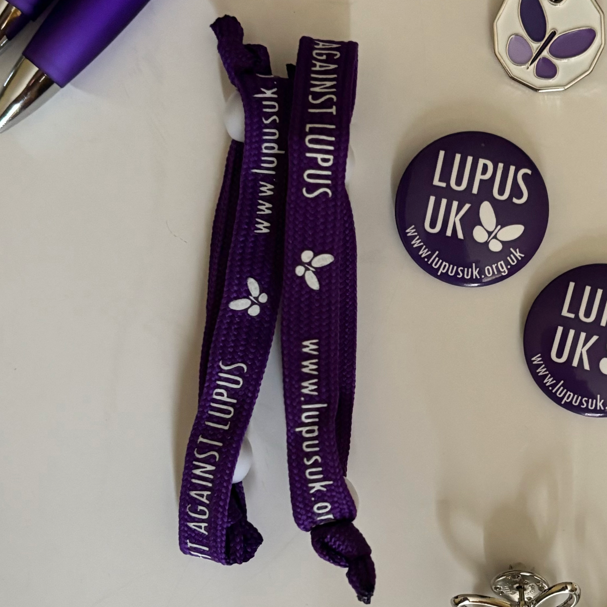 Purple wristband with white print reading 'Join the Fight Against Lupus' and along with the Lupus UK website address.