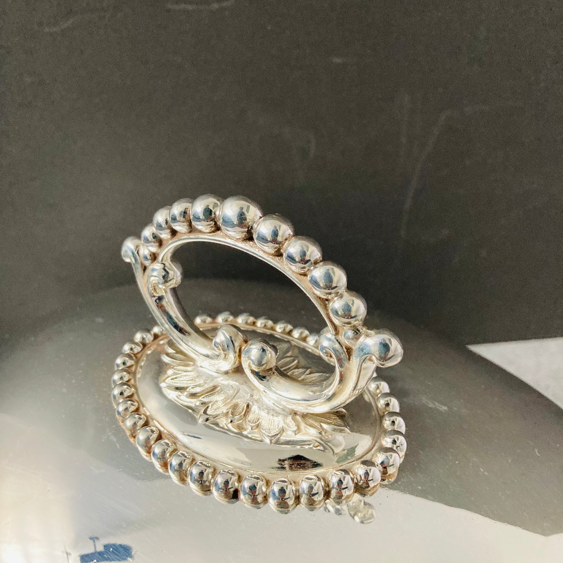 He is a fabulous and traditional piece silver plate dining with smooth plain body with detailed ornate edge beading on his handle.