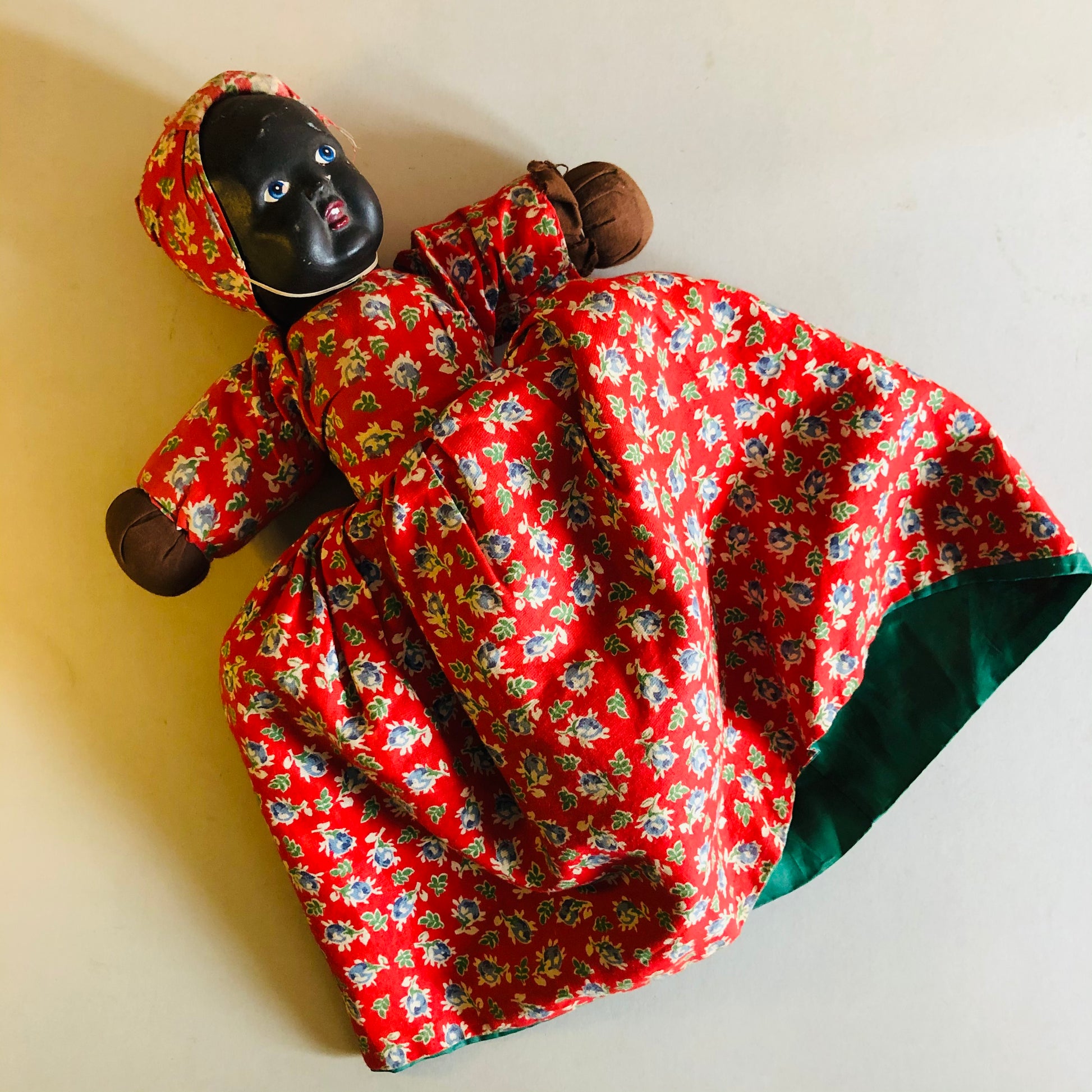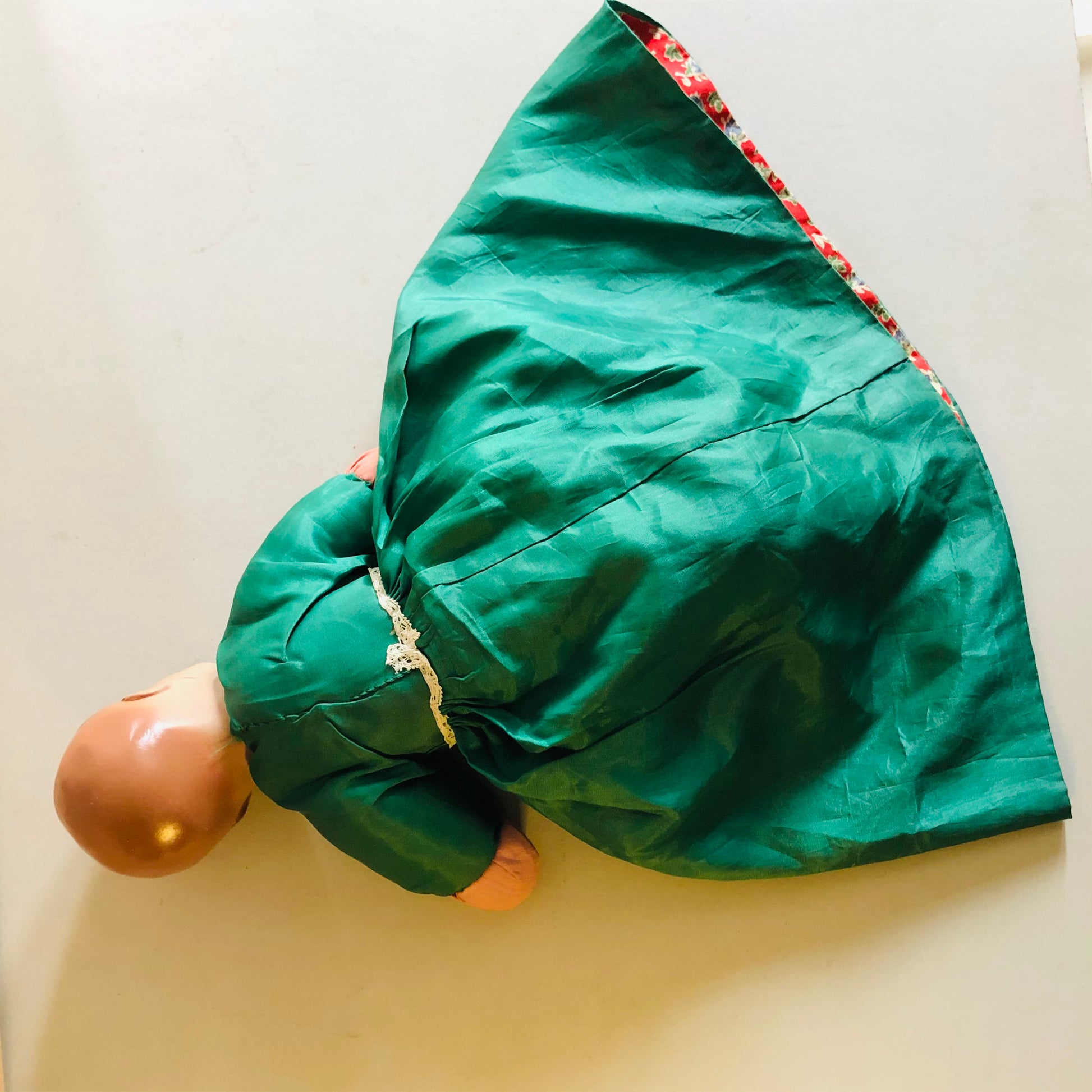 These dolls were once commonplace, yet Lola stands out with her hand-painted resin faces and vintage attire. A vibrant red and blue floral cotton dress on one side, and a rich emerald green taffeta on the other.
