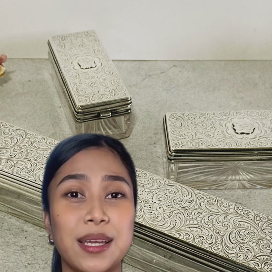 Her lids are in sterling silver and heavily detailed with floral and swirl leaf engraving. They also have a shield letter monogram that is too swirly for us to read.