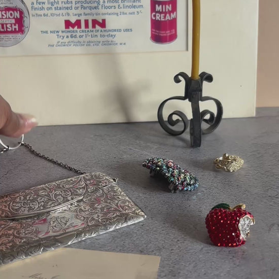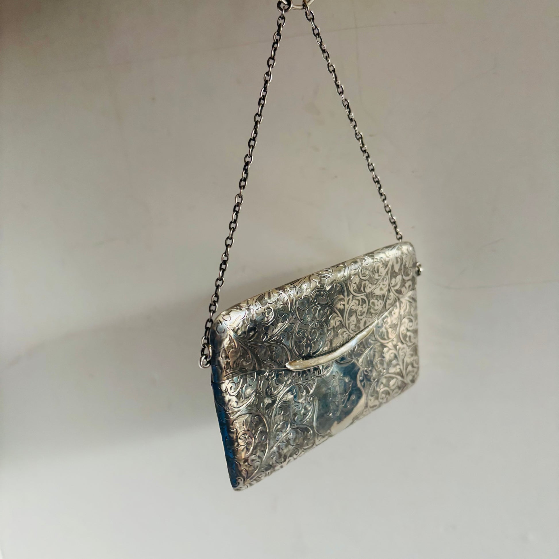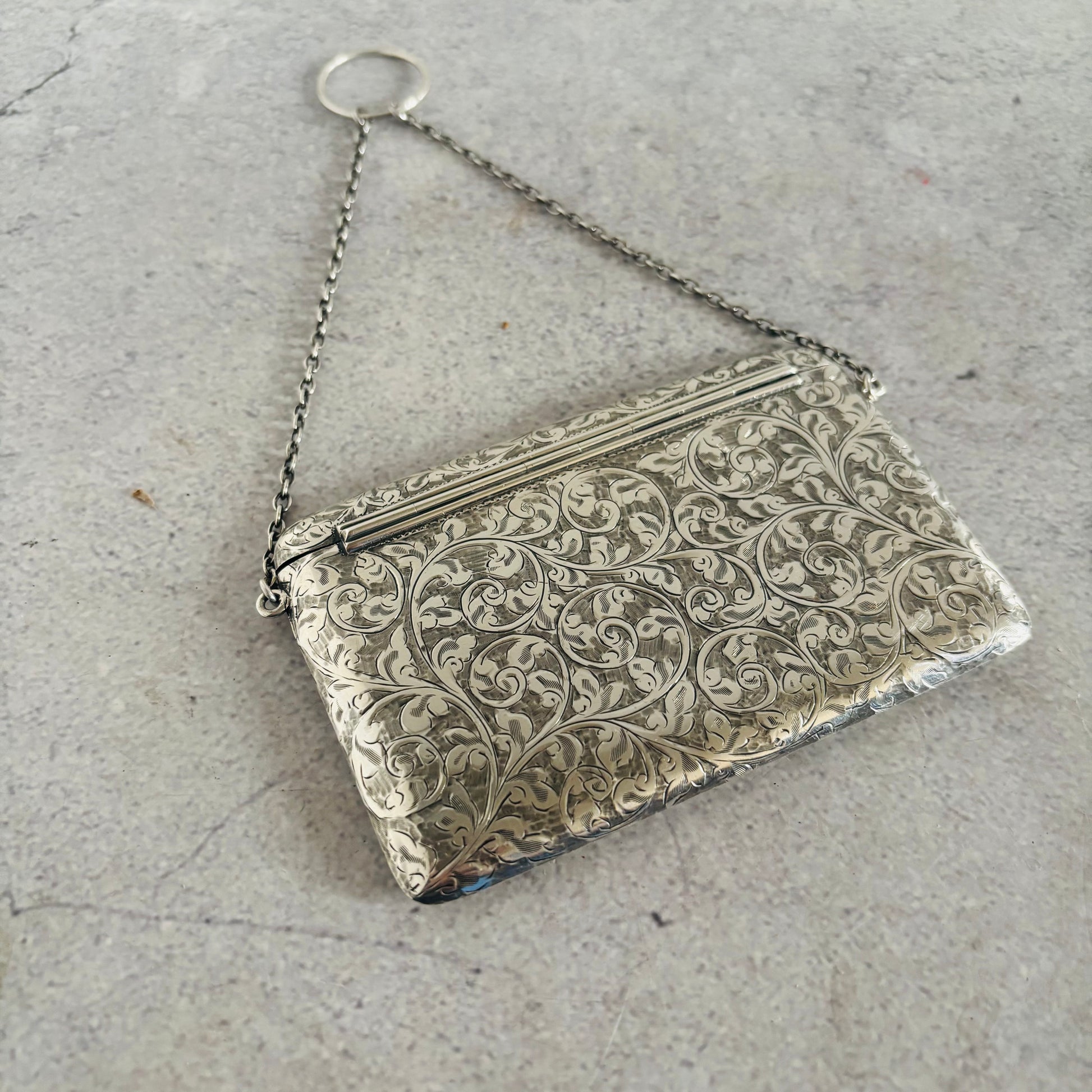 Leonard is a sterling silver ladies calling card purser case with chatelain finger chain.
