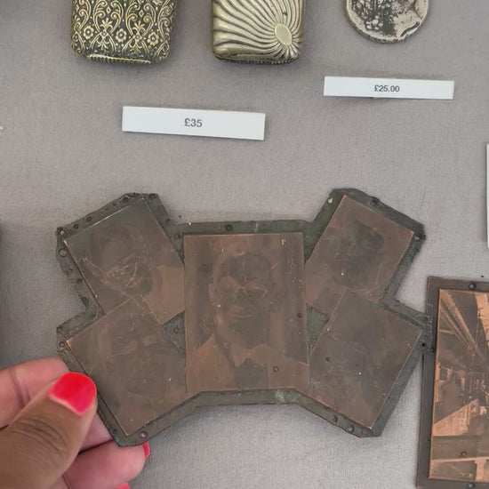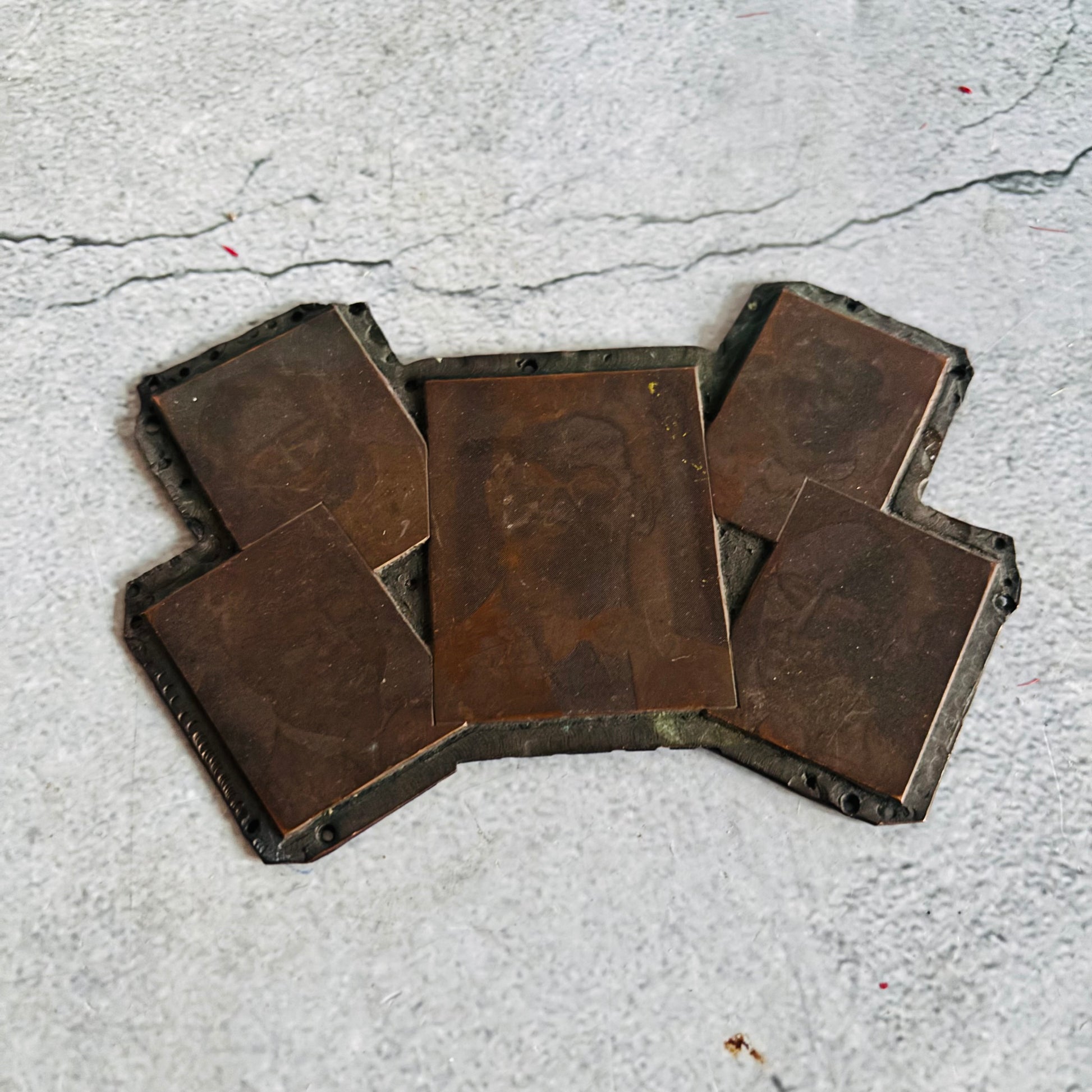 The antique copper printing plate featuring multiple portraits of men, unusaul shaped plate as its 4 images onto one plate. The people are likely connected to the Russian play Don Cossack Chorus & Dance. This commercial copper printing plate dates back to the early 20th century and offers a glimpse into the era’s life. These photographic images were transferred onto custom copper plates, positioned on pages using pins—evident from the remaining holes. By this time, copper plate printing had advanced significantly, enabling mass production of newspapers and magazines. Ideal for decorative use, these plates can be framed without glass, turned into coasters or trivets, or collected as unique wall tiles.