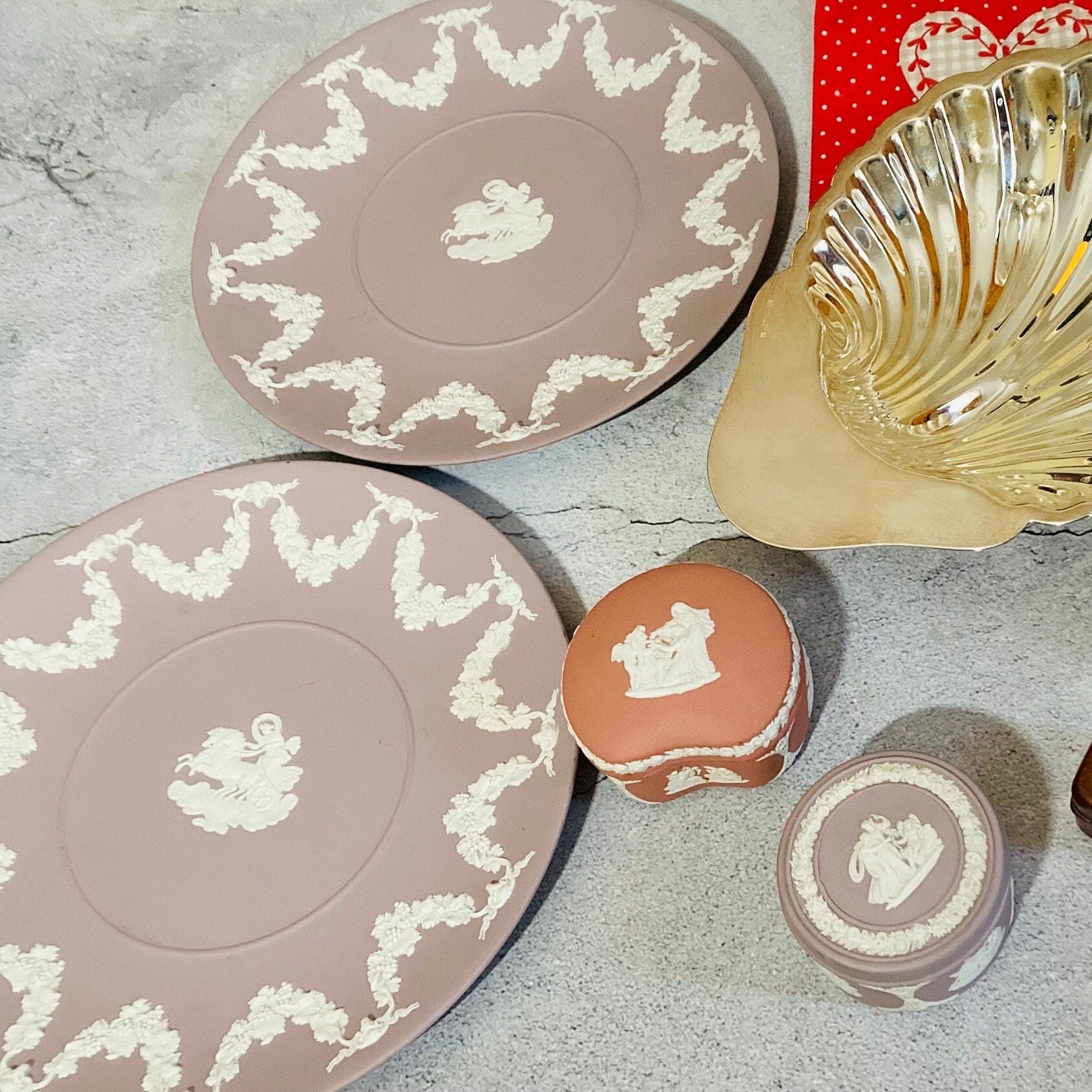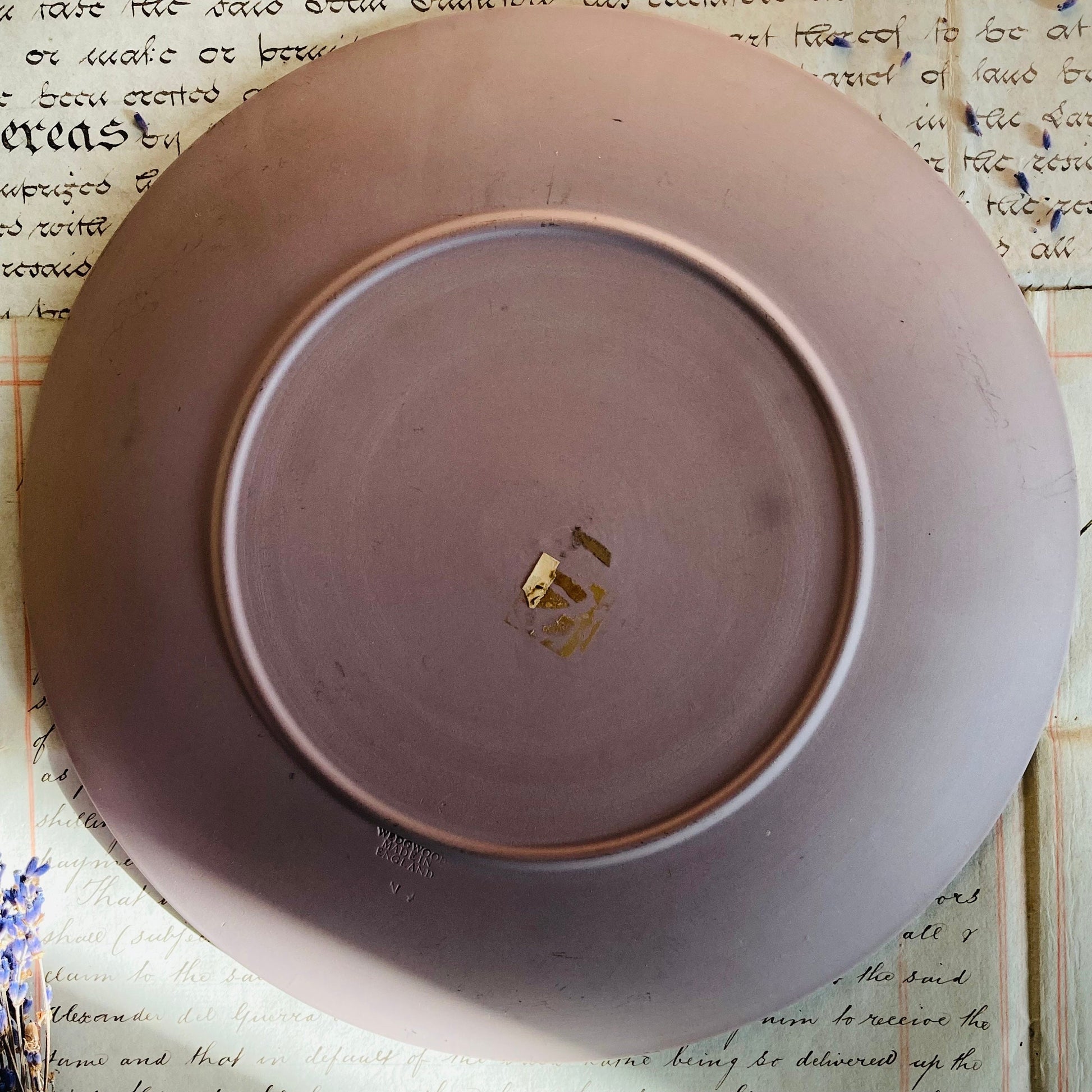 This Jasperware plate has central white bas-relief decoration depicting Neo classical depiction of classic Roman figures Aurora, goddess of the dawn, racing across the early morning sky in her horse-drawn chariot to announce the dawning of a new day.